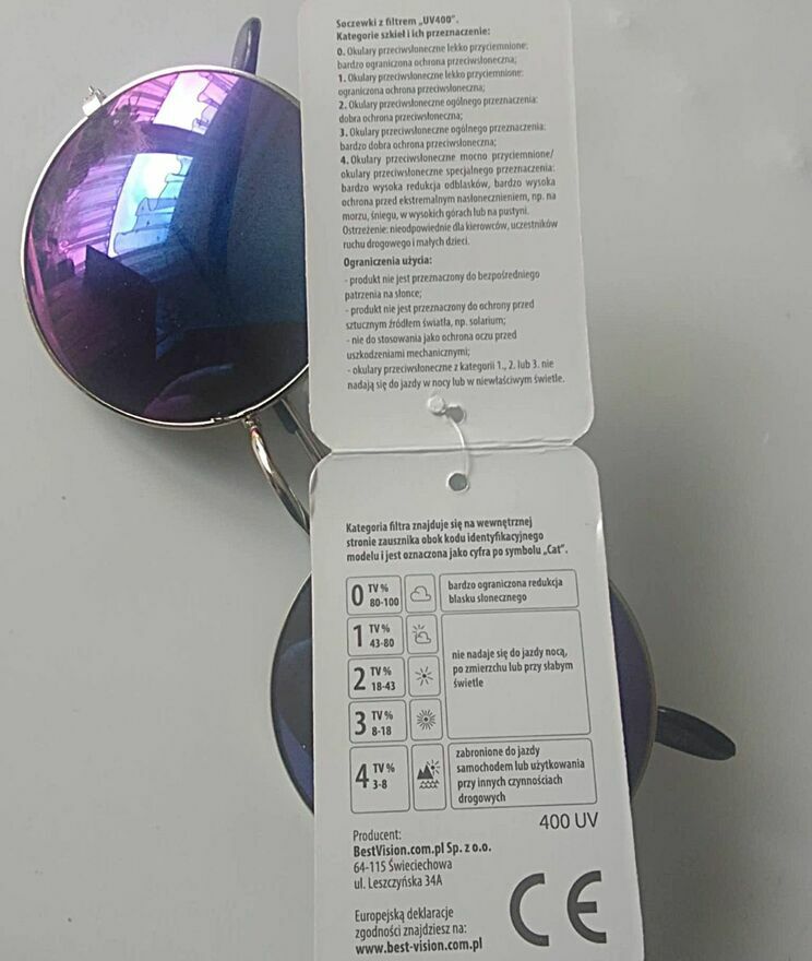 Okulary posiadają oryginalne oznaczenia na wewnętrznej stronie zauszników, m.in. numer modelu, kategoria filtra oraz oznaczenie zgodności CE.