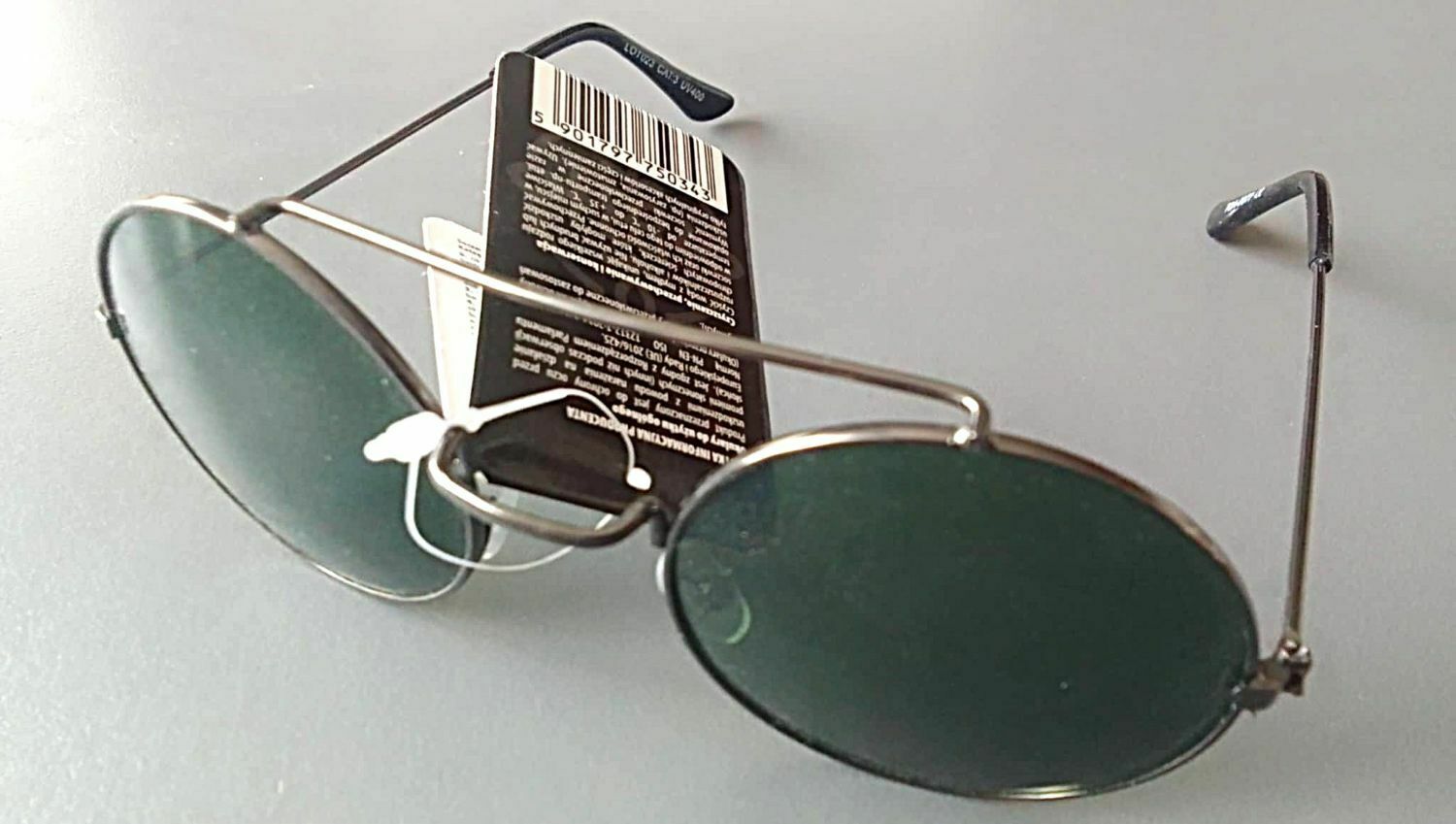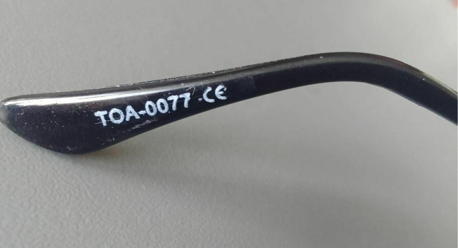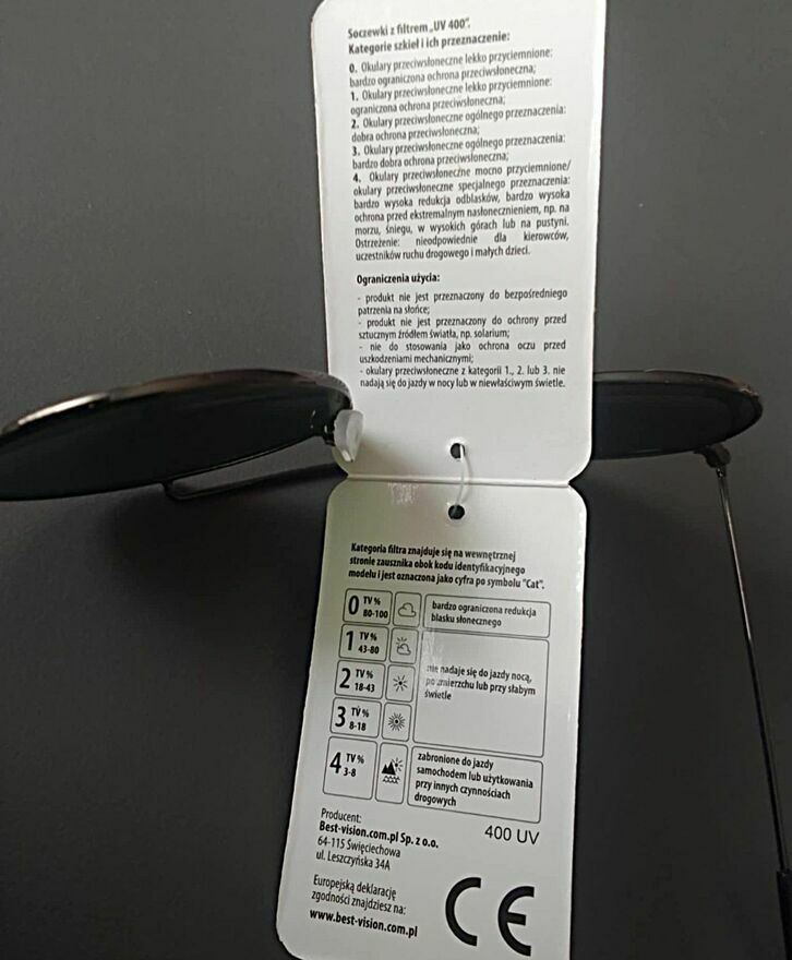 Okulary posiadają oryginalne oznaczenia na wewnętrznej stronie zauszników, m.in. numer modelu, kategoria filtra oraz oznaczenie zgodności CE.